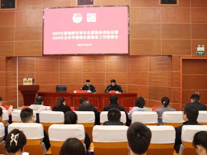 为深入学习贯彻习近平新时代中国特色社会主义思想,贯彻落实党的二十大精神,大力弘扬“奉献、友爱、互助、进步”的志愿服务精神,推进青年志愿服务精准化、常态化、便利化、品牌化,在全社会营造向上向善、互帮互助的良好风尚,3月5日下午,团市委组织召开2023年度铜陵市青年志愿服务表彰会暨2024年全市学雷锋志愿服务工作部署会,团市委副书记蒋业军、团市委宣传部负责人,各县区团委相关负责人,部分直属团组织负责同志共50余人参加会议。