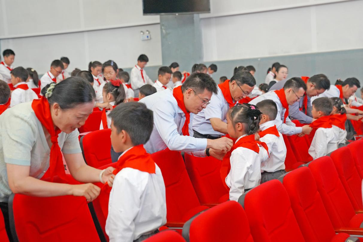 接着,参加活动的各位领导及少先队员代表为一年级新队员佩戴上鲜艳的红领巾,互敬队礼,传递责任和使命。大队长带领新队员握紧右拳、昂首挺胸,向着火红的队旗庄严宣誓,决心用自己的实际行动为红领巾增光添彩。