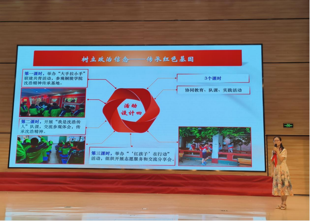 辅导员朋玉环以《传承红色基因 培育时代新人》为主题,从“认知—情感—信念—行为”四个环节进行设计,以实践活动、队课、仪式教育、协同教育等课程形式实施,让少先队员了解、感受、体悟、传承红色基因,通过大中小学思政课一体化建设和“红领巾奖章”争章活动的融合,旨在增强少先队员的政治意识,激发政治情感,全面实现本单元“政治启蒙”的育人目标。
