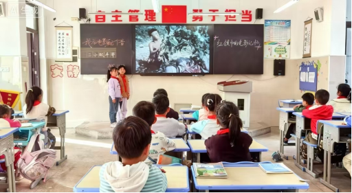 铜陵市人民小学蓝海校区少工委银幕上播放着《二小放牛郎》,英雄们为了理想信念挺身而出的身影,深深打动着每一位队员的心,观影现场不时响起阵阵掌声。