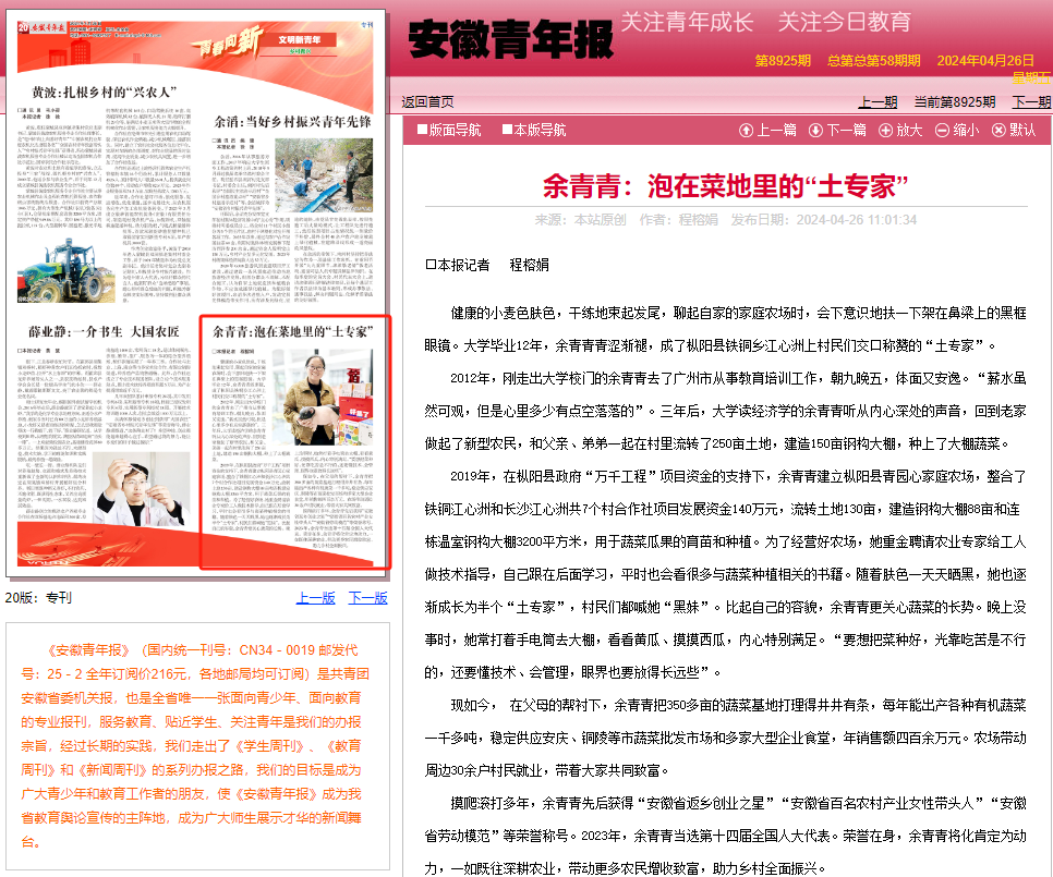 《安徽青年报》报道铜陵青年《余青青:泡在菜地里的“土专家”》