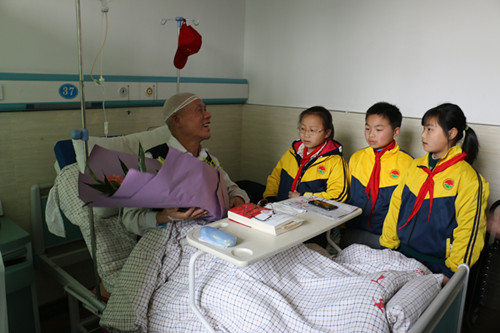 “爱心爷爷”汪荣振与少先队员亲切交流 日前,东方红小学的3名少先队员自发来到了市人民医院,看望生病住院的爱心爷爷汪荣振。“汪爷爷,您身体现在好点了吗?希望您能早日康复!”几个孩子拉着汪荣振老人的手,关心地问。“我感觉好多了!谢谢你们能来看我。”汪荣振老人看着簇拥在病床前的孩子们,满脸都是幸福的微笑。 汪荣振和这些少先队员的缘分,是从2014年 “千人千愿•微爱圆梦”活动开始的,在看到东方红小学几名少先队员的微心愿之后,汪荣振认领了这些愿望,为孩子们送去了书包、文具、书籍和体育用品。“汪爷爷,您送我的《雷锋的故事》我一直在读。”少先队员徐珊珊告诉汪爷爷,“听说您生病了,我很想来看看您。”在病床前,孩子们给汪爷爷送上了鲜花和礼物,并关切地询问汪爷爷的病情,“希望您保重身体,我们还想再听一听您的讲座,跟您一起参加社区活动呢。”孩子们的到来,让汪荣振非常感动:“你们把学习搞好就是我最大的心愿。等我病好了,一定再去看望你们!” 汪荣振老人是友好社区的一名居民,自退休后一直致力于社区公益事业。他长年肩戴红袖章,手拿小铲子和水壶在铜陵的街头巷尾铲除小广告。每到中午,他还会在学校门口维持交通秩序,保证孩子们上下学的安全。汪老还创立了以自己的名字命名的志愿者服务队,以号召更多的人加入到志愿者团队中。汪老也因此被授予“江淮志愿服务典型”、“铜陵好人”、“铜陵市文明创建终身督察员”等称号。在“千人千愿•微爱圆梦”活动开展至今,汪老还愿了15名小朋友的心愿,爱心款总计将近800元。 |