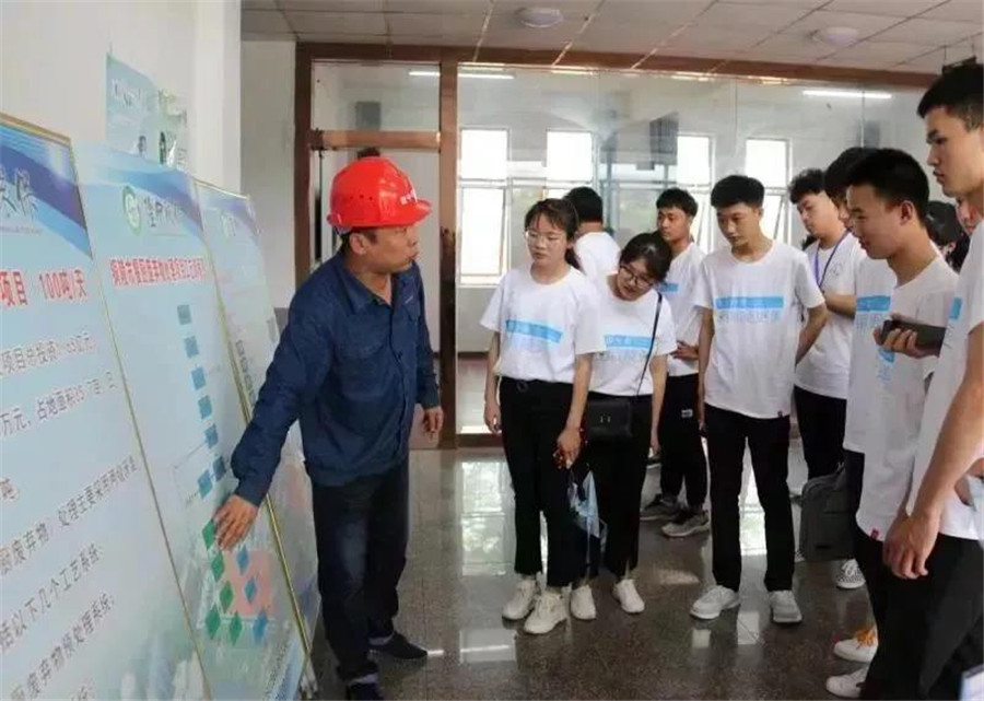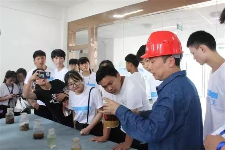 在铜陵市隆中环保有限公司,工作人员指着操作间内正在运转的机器向青年志愿者们作逐一介绍。通过对当天的餐厨废弃物资源化利用的观摩,大家感受到了我市餐厨废物的环保化处理方式和现状。