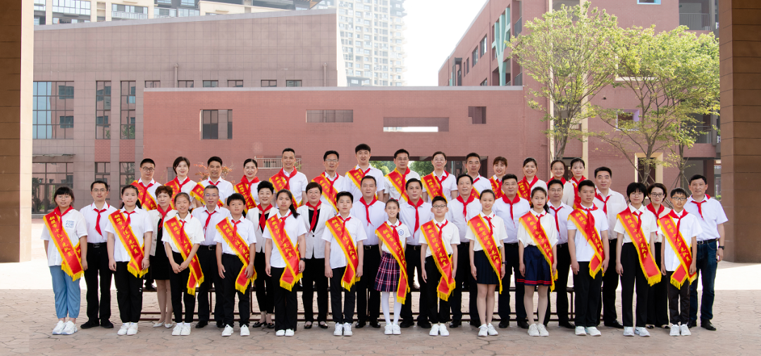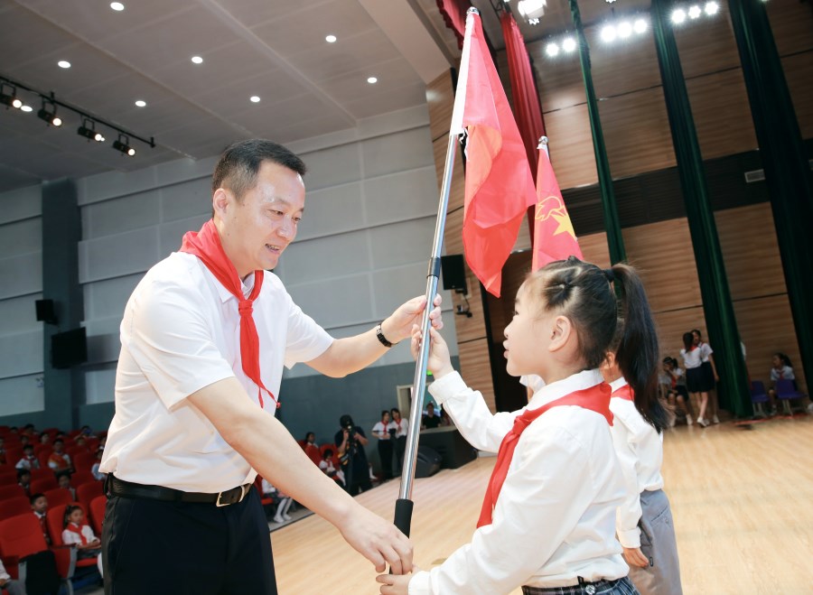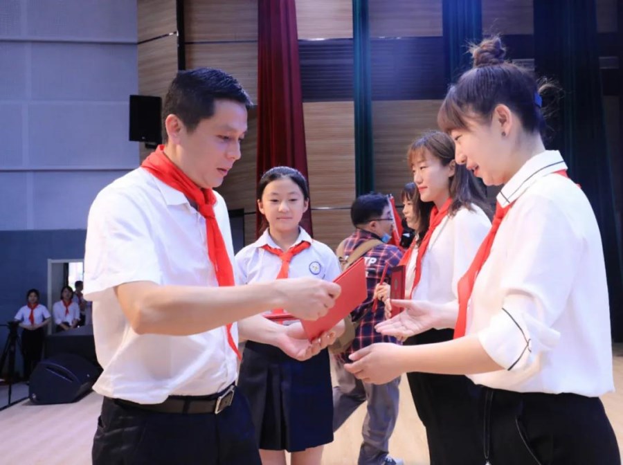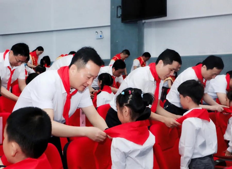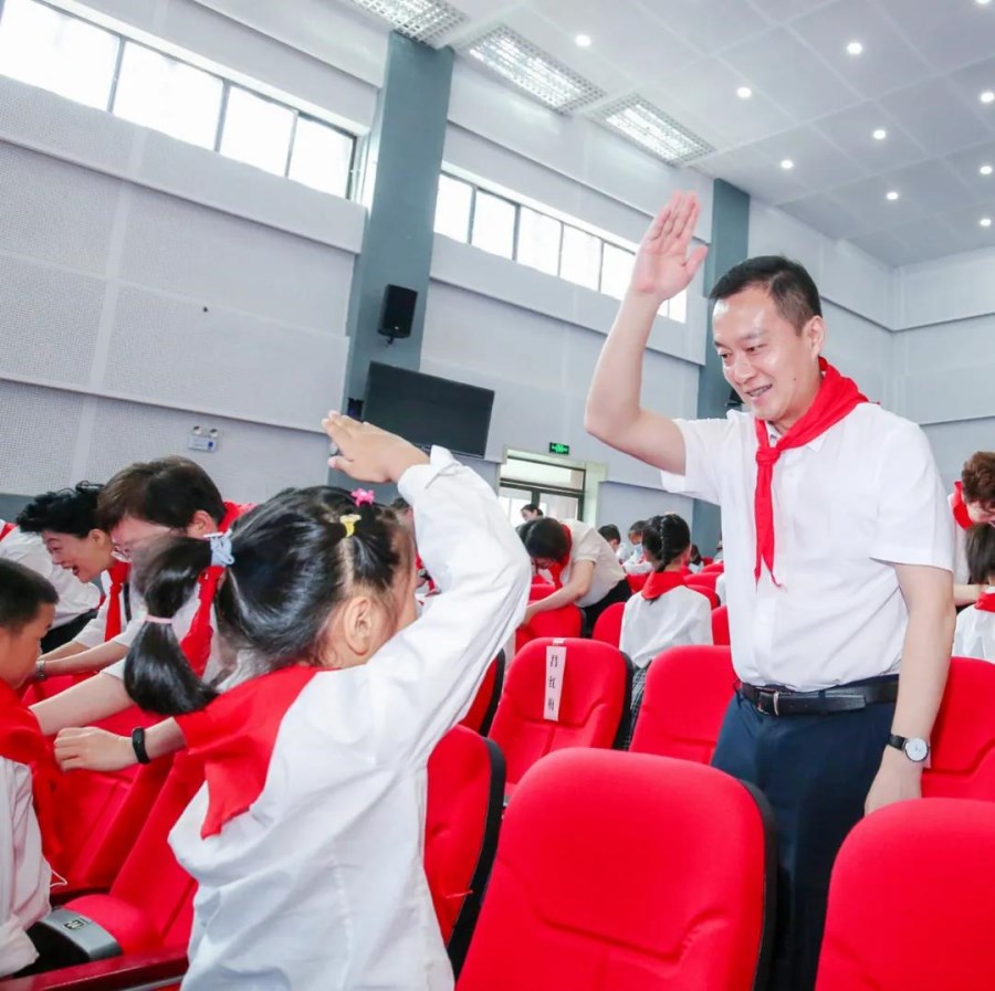 孔涛、杨正一行走进市实验小学铜都校区,在欢快嘹亮的鼓号声中,少先队员们迎上前来,为他们佩戴鲜艳的红领巾,表达师生们的热烈欢迎,分享节日的快乐。