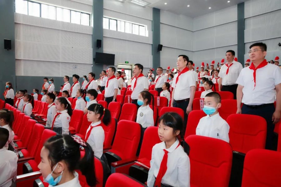 在学校报告厅,孔涛、杨正一行共同观摩了2021安徽省暨铜陵市“红领巾心向党”庆“六一”新队员入队仪式,为新入队的少先队员戴上红领巾、赠送入队礼物,向他们表达美好祝愿。