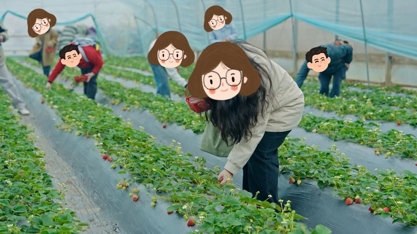 在草莓园中,青年们结伴采摘,大家俯身挑选、相互分享采摘技巧,欢声笑语回荡在田垄之上。亲手摘下的草莓不仅装满了竹篮,更拉近了彼此的距离,陌生感在采摘的乐趣中悄然消散。
