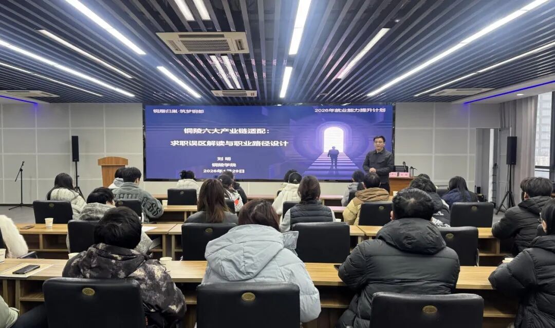 为深入实施“铜雁归巢”行动计划,切实服务铜陵籍青年及返乡大学生就业需求,助力青年提升就业竞争力、扎根家乡发展,由共青团铜陵市委员会、铜陵市人力资源和社会保障局联合主办,各县区团委承办的“铜雁归巢·筑梦铜都”2026年就业能力提升计划,于1月29日下午正式拉开帷幕。首场以“就业形势与职业规划”为主题的培训成功举办,吸引了30名青年学子参与。
