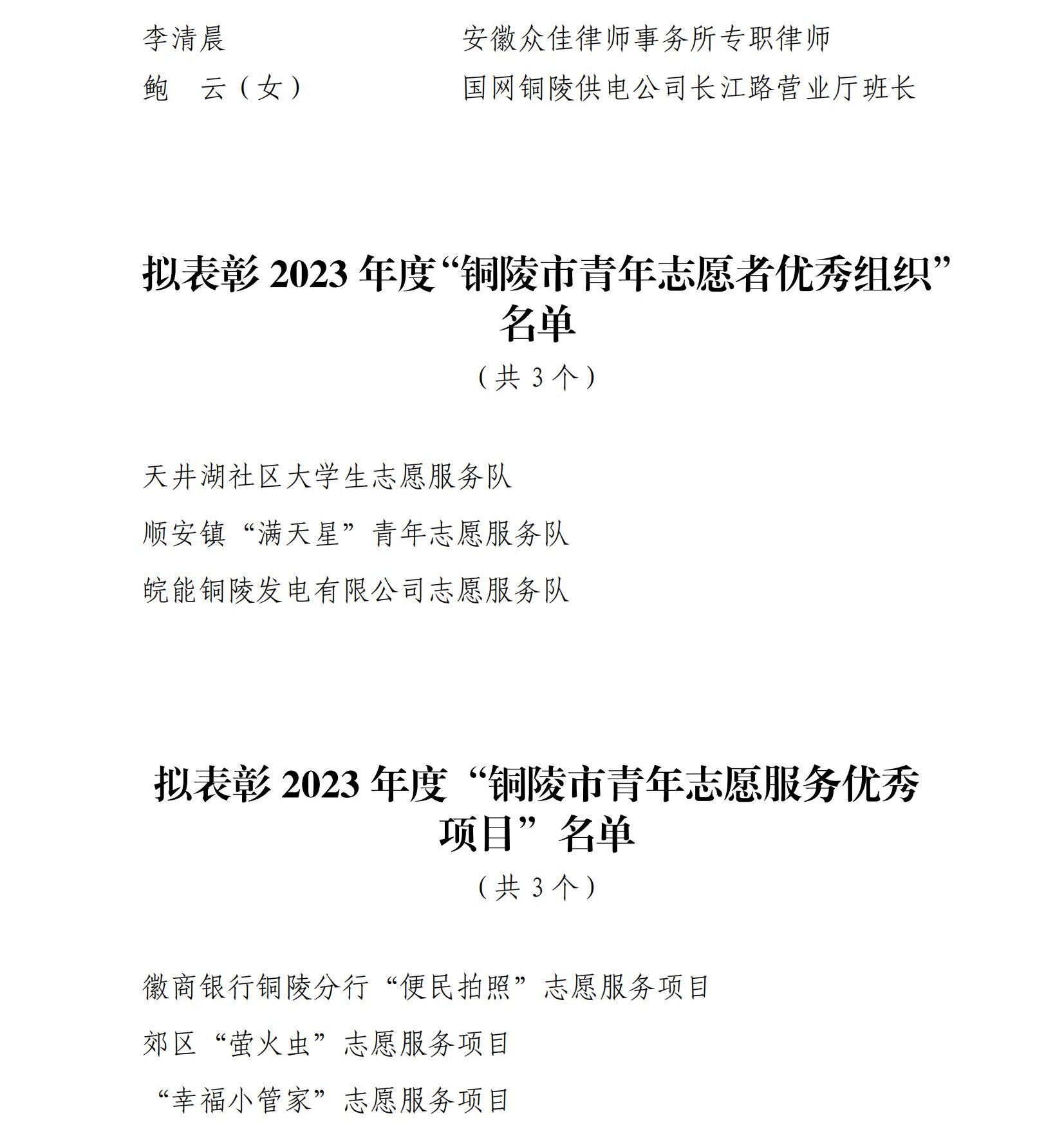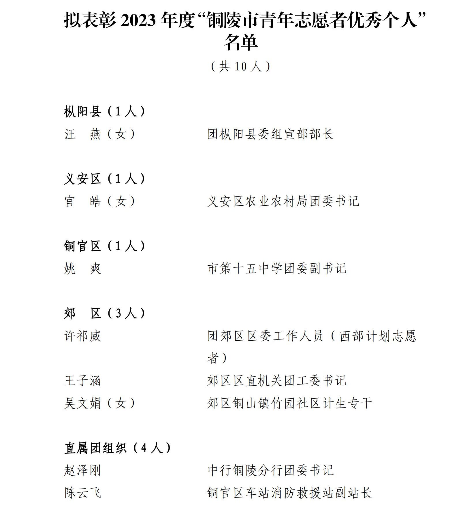 关于2023年度“铜陵市青年志愿者优秀个人”“铜陵市青年志愿者优秀组织”“铜陵市青年志愿服务优秀项目”评选情况的公示