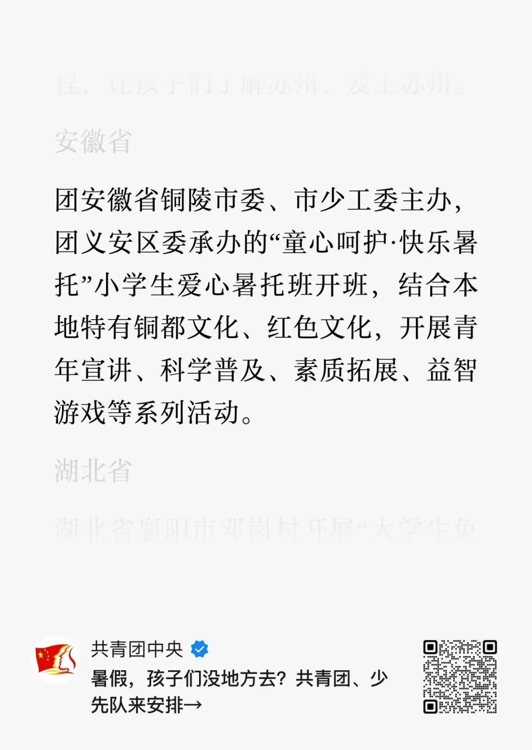 共青团中央公众号报道铜陵暑假爱心托管班工作
