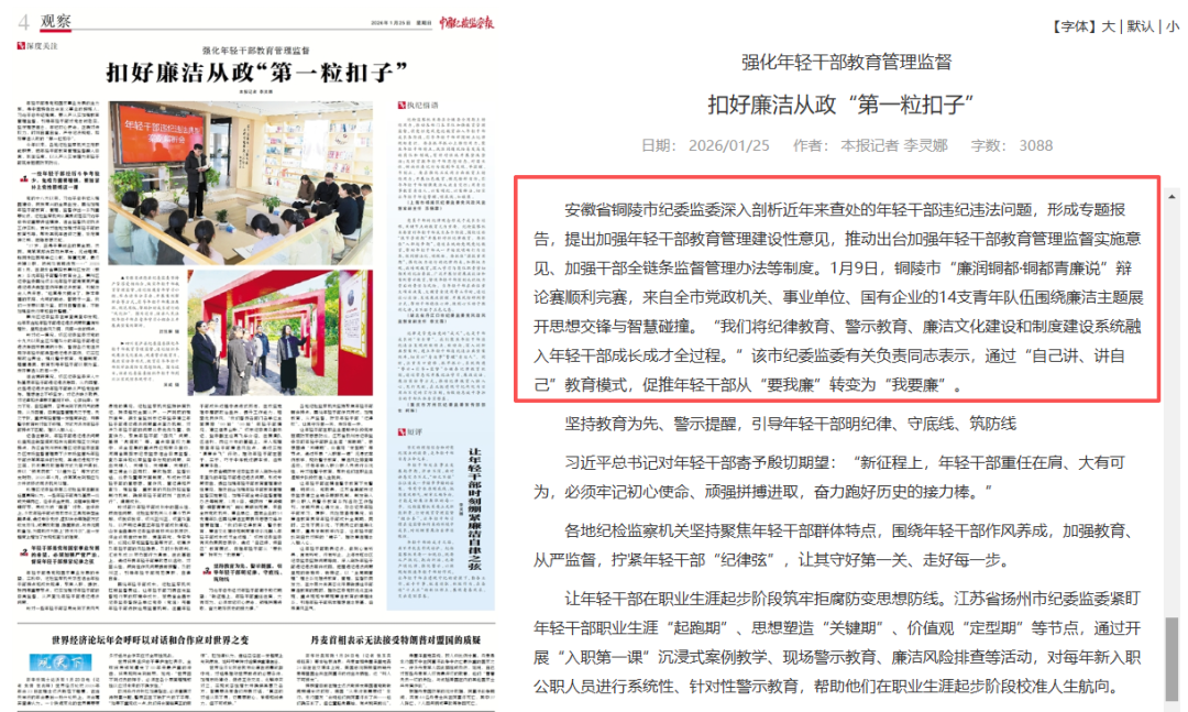 1月25日,《中国纪检监察报》4版“深度关注”专栏推出整版文章《扣好廉洁从政“第一粒扣子”》,报道我市加强年轻干部教育管理监督工作,介绍了我市将纪律教育、警示教育、廉洁文化建设和制度建设系统融入年轻干部成长成才全过程相关做法。