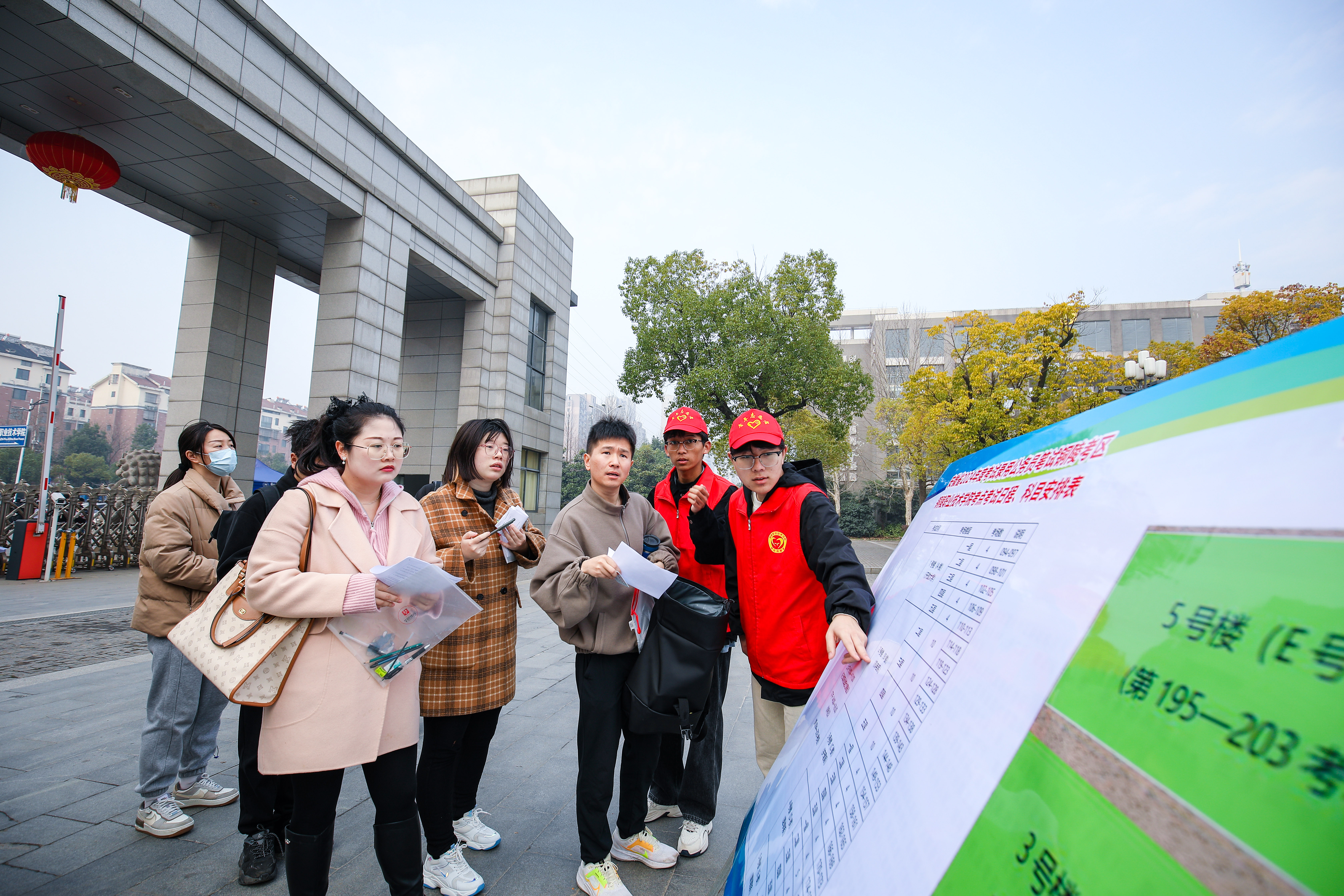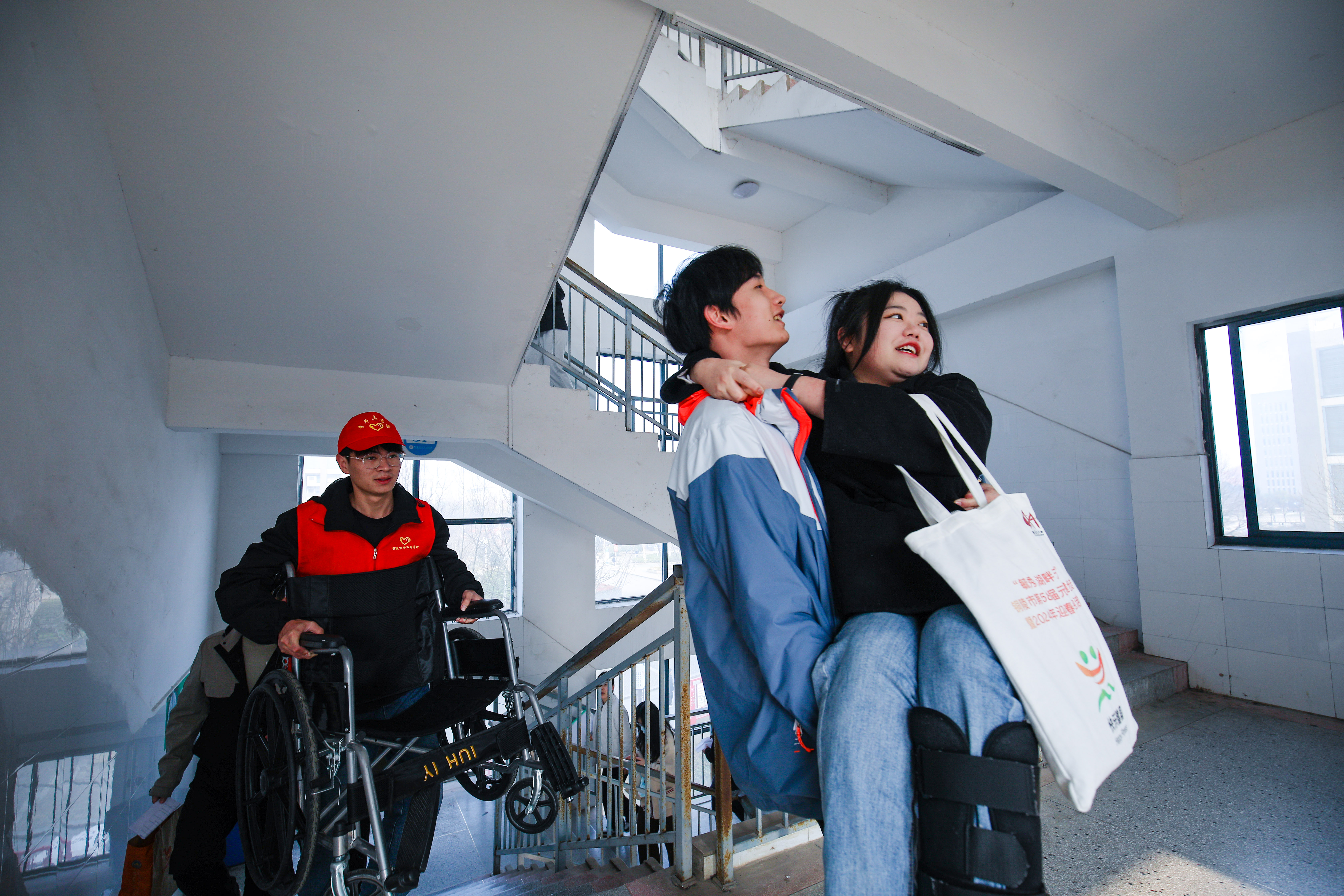 在铜陵职业技术学院考点,考生程女士因为腿部受伤,需要坐轮椅进入考场。她刚来到学校门口,青年志愿者们就发现了她的困难,立马主动上前提供帮助,和考生家属、朋友一起协助考生上楼,帮助考生提拿考试用品和轮椅,联系考点考务工作者在符合考试相关规定的情况下为考生提供交通等方面的便利。