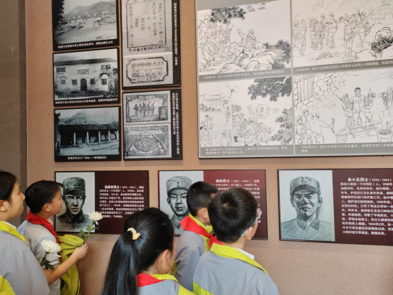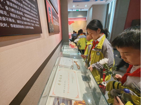 “我志愿加入中国少年先锋队……”在烈士纪念塔前,少先队员们重温入队誓词,铿锵有力的誓言回荡在陵园上空。随后,园区志愿者通过生动讲述革命烈士事迹,带领大家回顾了铜陵地区的红色历史。活动特别设置了“红色印记”打卡环节,孩子们在纪念馆内认真聆听讲解,驻足观看珍贵文物,通过沉浸式体验感受革命先辈的奋斗精神。