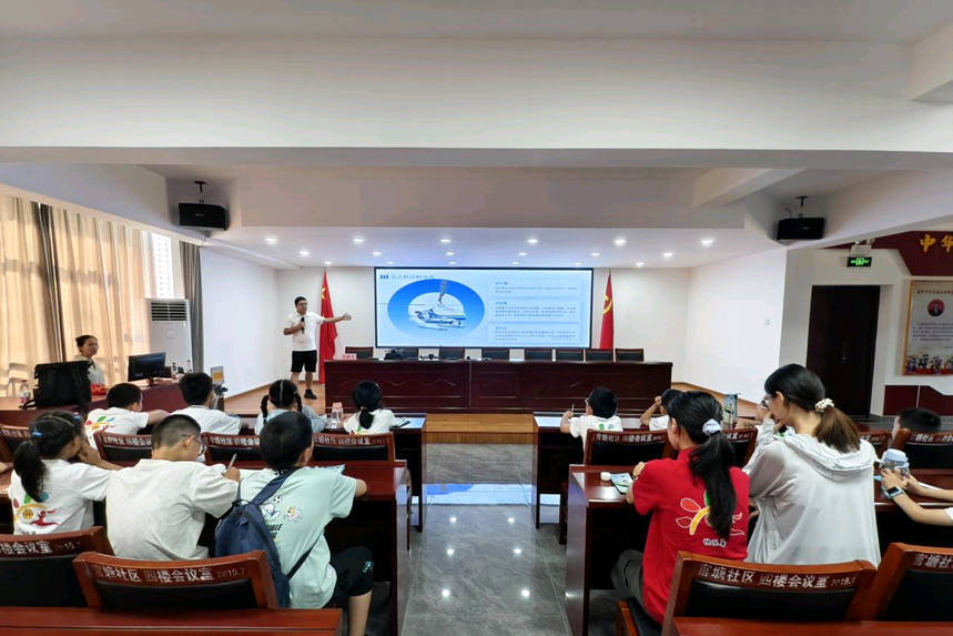 社区活动室内,讲师深入浅出地为孩子们讲解无人机的基本原理、系统构造、应用领域以及在发展历史中所扮演的重要角色。通过生动的图片、视频演示和模型展示,带领孩子们认识旋翼、飞控、传感器、遥控器等核心部件,了解无人机的种类划分及其在航拍、测绘、农业、救援、运输等多个行业的广泛应用。孩子们聚精会神地聆听,积极举手互动,现场气氛活跃。