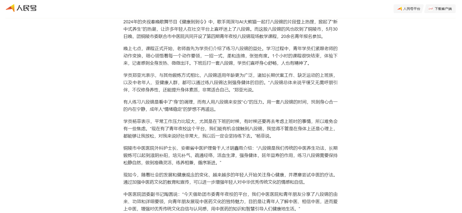 人民日报客户端报道《不爱“夜宵”爱“夜校” 铜陵青年掀起八段锦热潮》